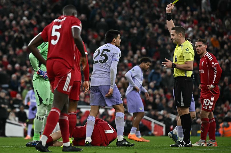 El árbitro Craig Pawson le mostró a Gómez una tarjeta amarilla después de que atrapó a Wirtz en el borde del área penal del Liverpool con una bota alta durante la primera mitad de la victoria de los Rojos por 2-0 el sábado .