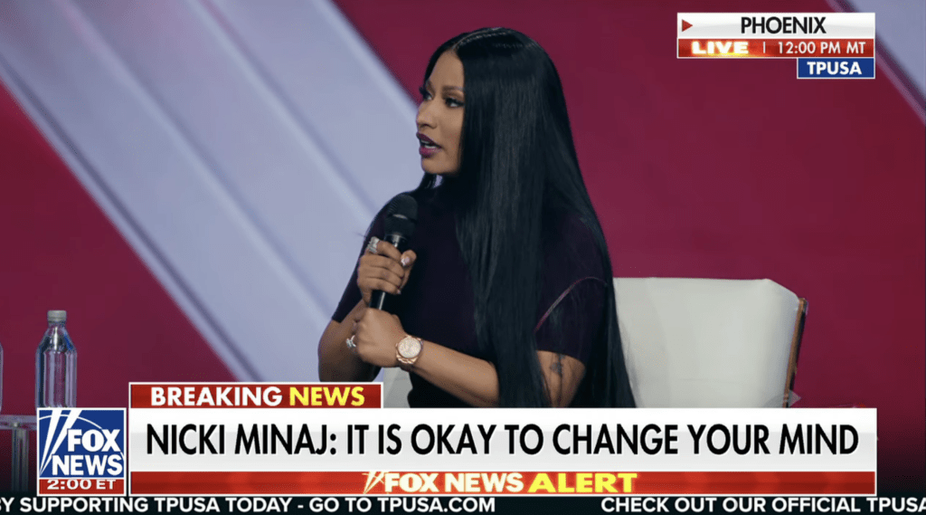 Cuando Minaj le preguntó sobre las reacciones negativas que ha enfrentado por sus opiniones ahora de derecha, Minaj, que ha dedicado sus últimos tiempos en las redes sociales a ser combativa en estos temas, recibió aplausos cuando afirmó: «No me di cuenta».
