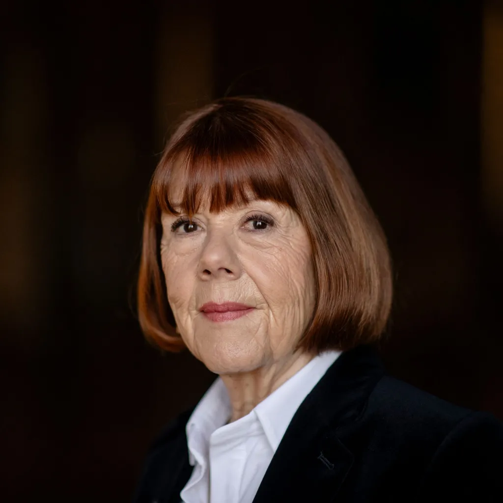 Gisèle Pelicot, con una camisa blanca y un blazer negro, mira por la ventana del Hôtel de Ville en París, Francia.