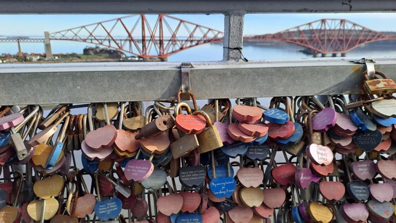 David Lee Dos personas se recortan contra un cielo rojo en el puente colgante de Inverness.David Lee